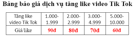 Tham khảo bảng giá dịch vụ tăng lượt like trên Tiktok: